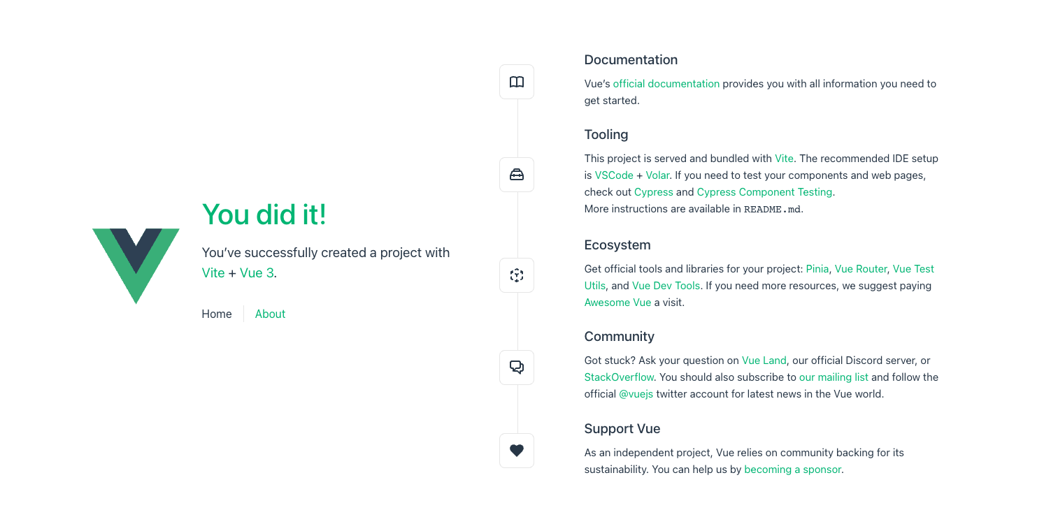 터미널의 로컬호스트 주소로 이동하면 위 브라우저처럼 Vue 프로젝트가 정상적으로 실행된 것을 확인할 수 있습니다.