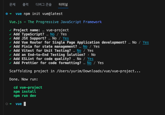 아래 명령어 입력 시, Vue.js의 최신 버전이 설치되고, 프로젝트 초기화 및 설정 파일 생성