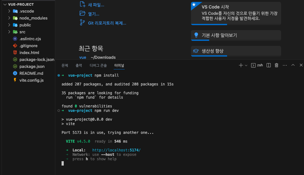 위 이미지처럼 프로젝트 초기화 및 설정 후, 생성된 vue-project 파일을 vs코드로 오픈합니다.